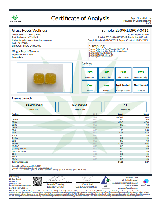 This is a COA for the Peach Gummy strain from 09/30/2025.